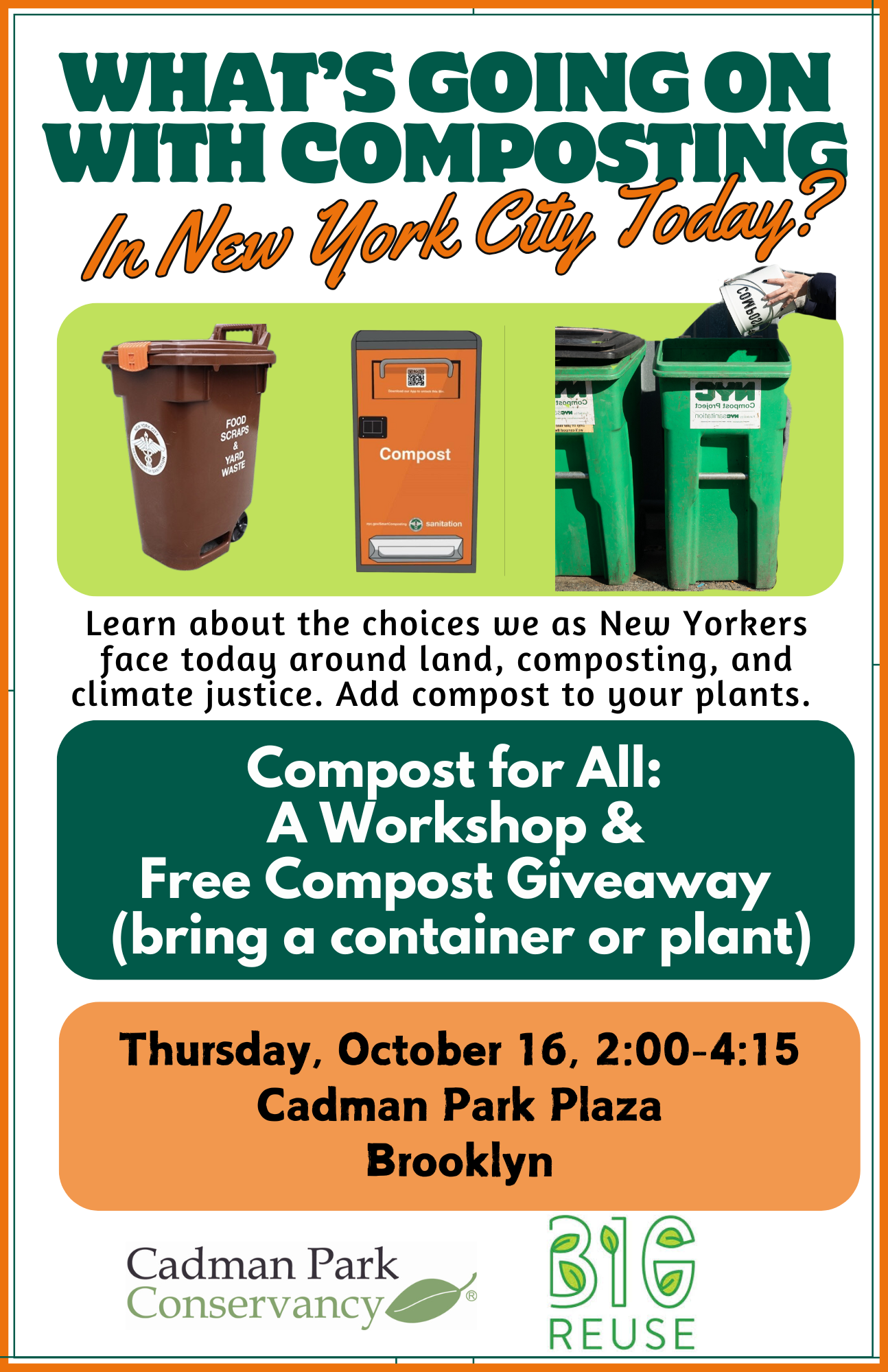 Join the Cadman Park Conservancy on Thursday, October 16th, welcoming back Big Reuse to Cadman. Meet Outreach Associate, Lin Mo from Big Reuse for a compost workshop and compost giveaway. We will be in front of the Brooklyn War Memorial. We are looking forward to seeing you in the park!